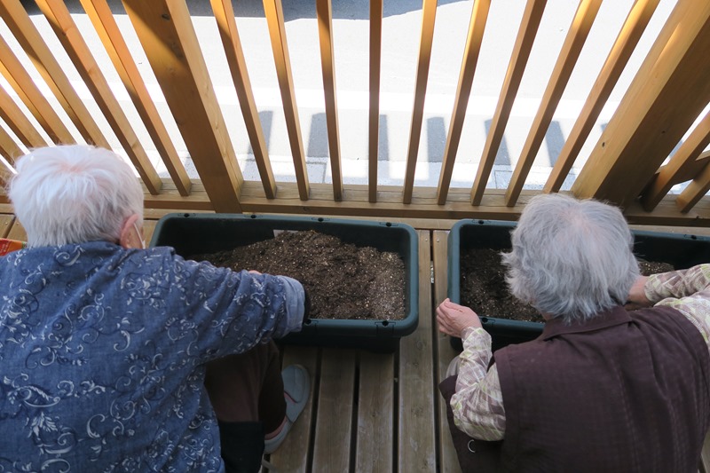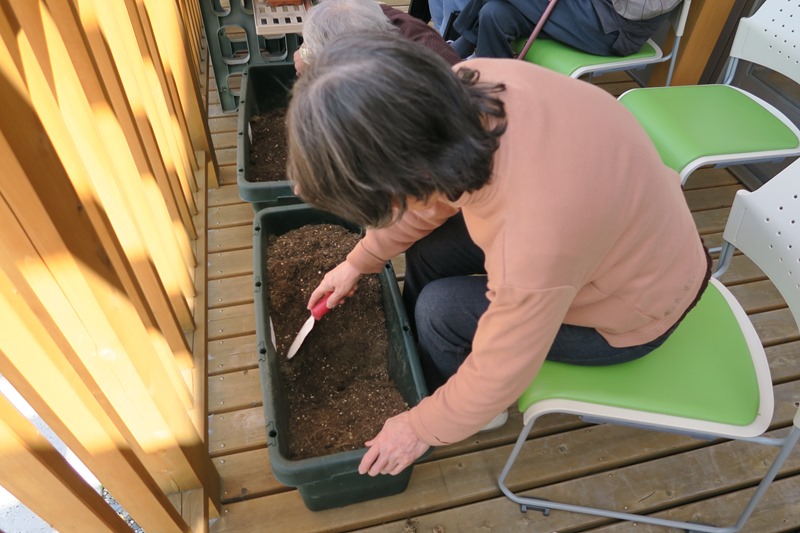 天気も良く、とても気持ちのいい風が吹く中、旭ショートのウッドデッキに並ぶプランターに苗植えをしました(*^^)v