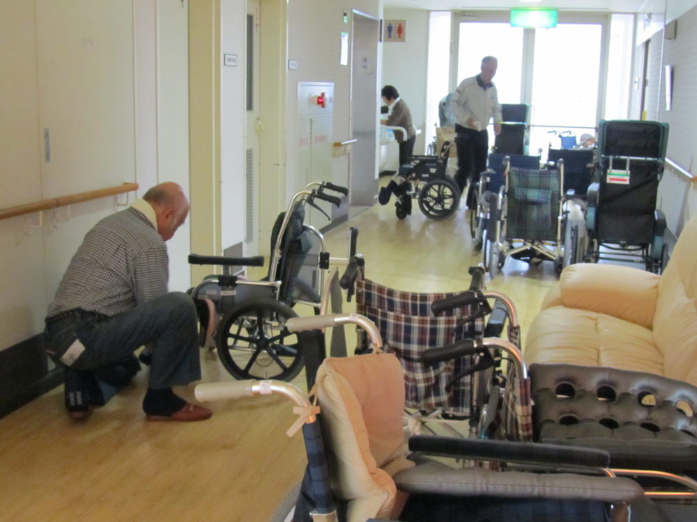 入居者58名の大小さまざまな車椅子がズラリと並んでいます。本当に大変な作業です。