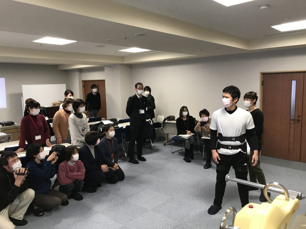※当苑から持ってきたHALを装着して体験していただいているところ。
