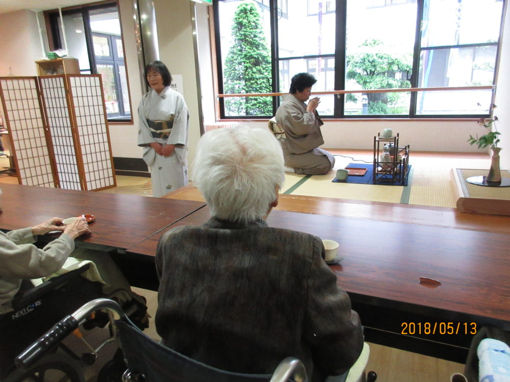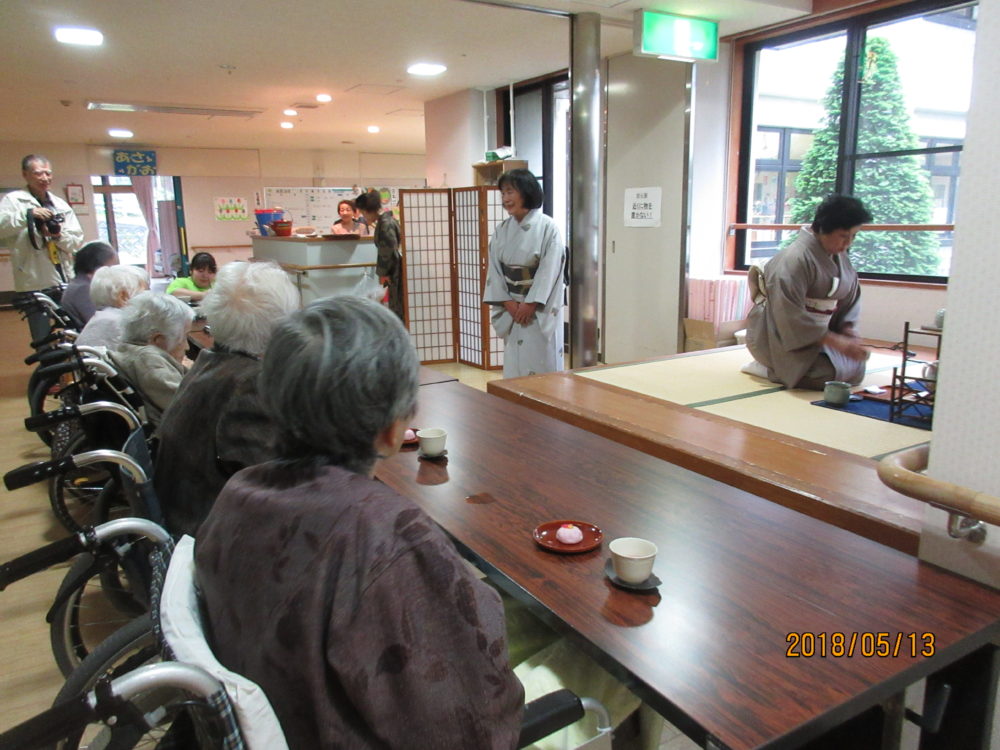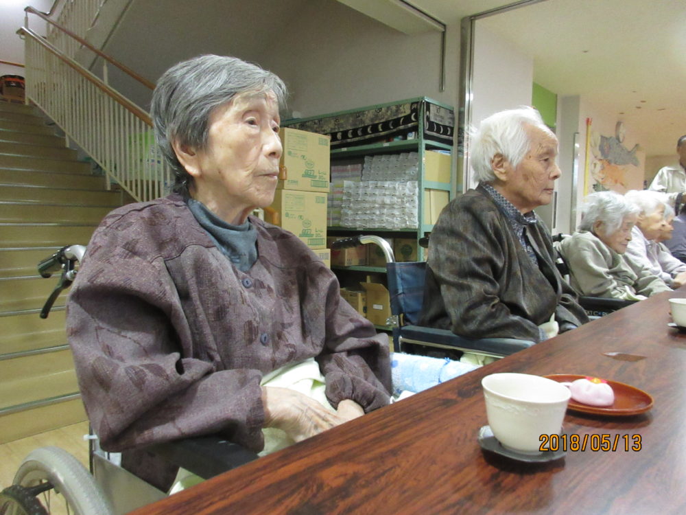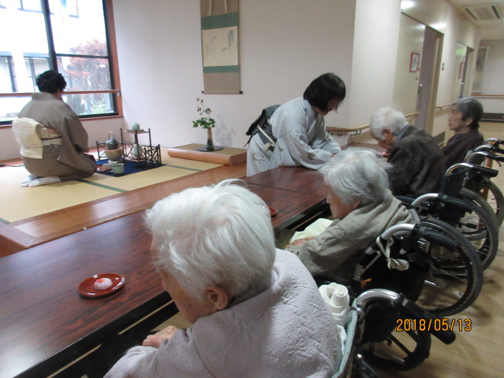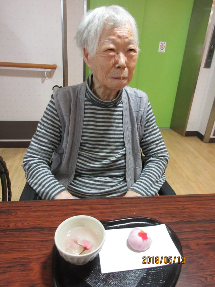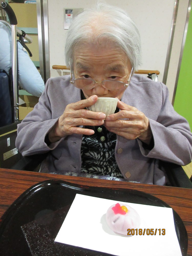 お茶会のためにおしゃれをしてきてくださった100歳の方です。「お作法はわからんけど、桜のいい香りがしておいしいよ~。」と喜んでくださいました。