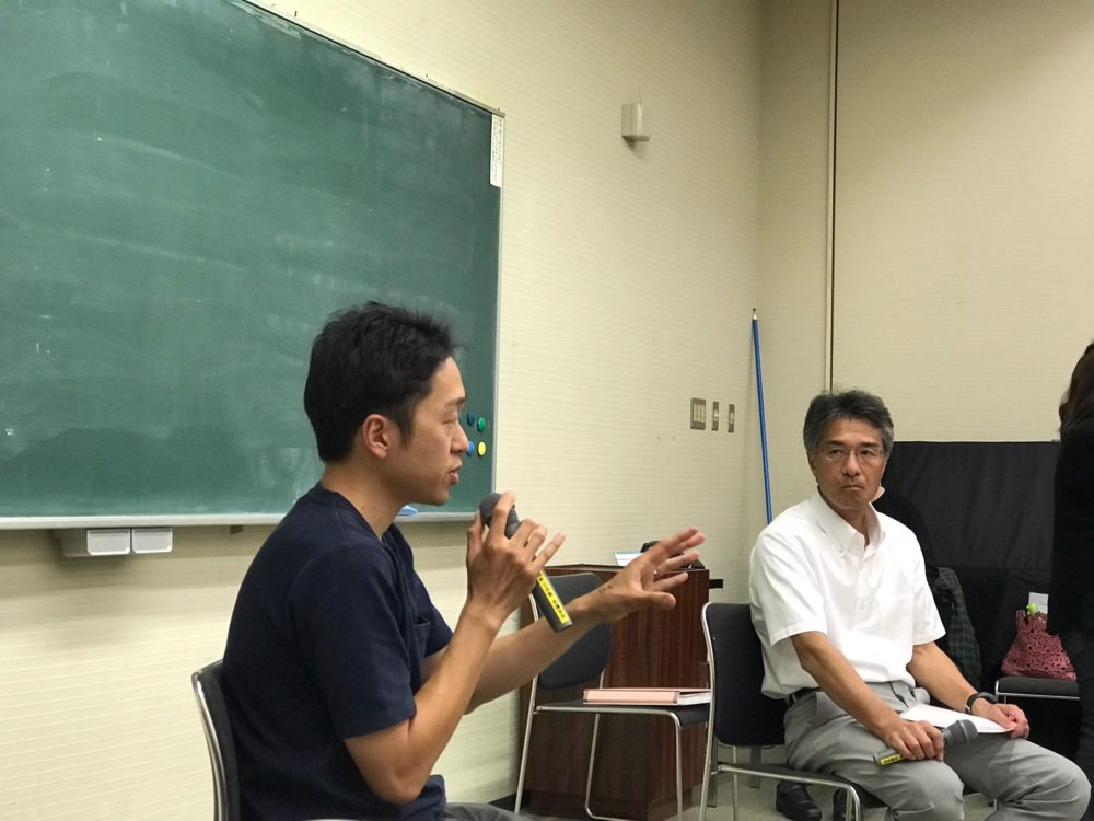 前半は各種連絡事項でしたが、後半は希夢千家けいちゃんの坂本佳祐氏にお越し頂き、清水施設長と対談形式でお話いただきました。
