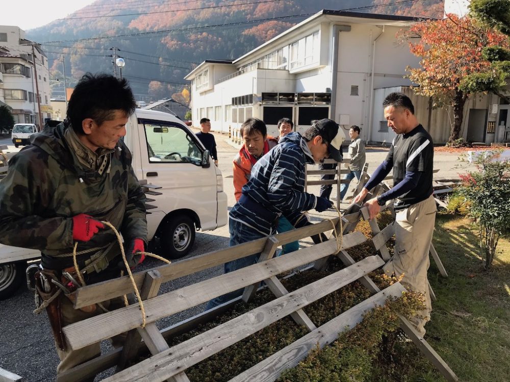 11/11(日)なおい会雪囲い・掃除ボランティア なおい会 投稿日: 2018/11/11 日曜日 カテゴリー: できごと k.kamikuzu 平成30年11月11日(日)なおい会の皆様(17名)に、雪囲い・掃除ボランティアを行っていただきました。 なおい会の皆様には、継続して毎年ボランティア活動をしていただいています。 雪囲いを運ぶ姿も手馴れたもの。 男縛りも伝統の域。 きれいに雪囲いをしていただきました。 女性のみなさまにはベランダのお掃除をしていただきました。 なおい会のみなさま、ありがとうございました。 なおい会