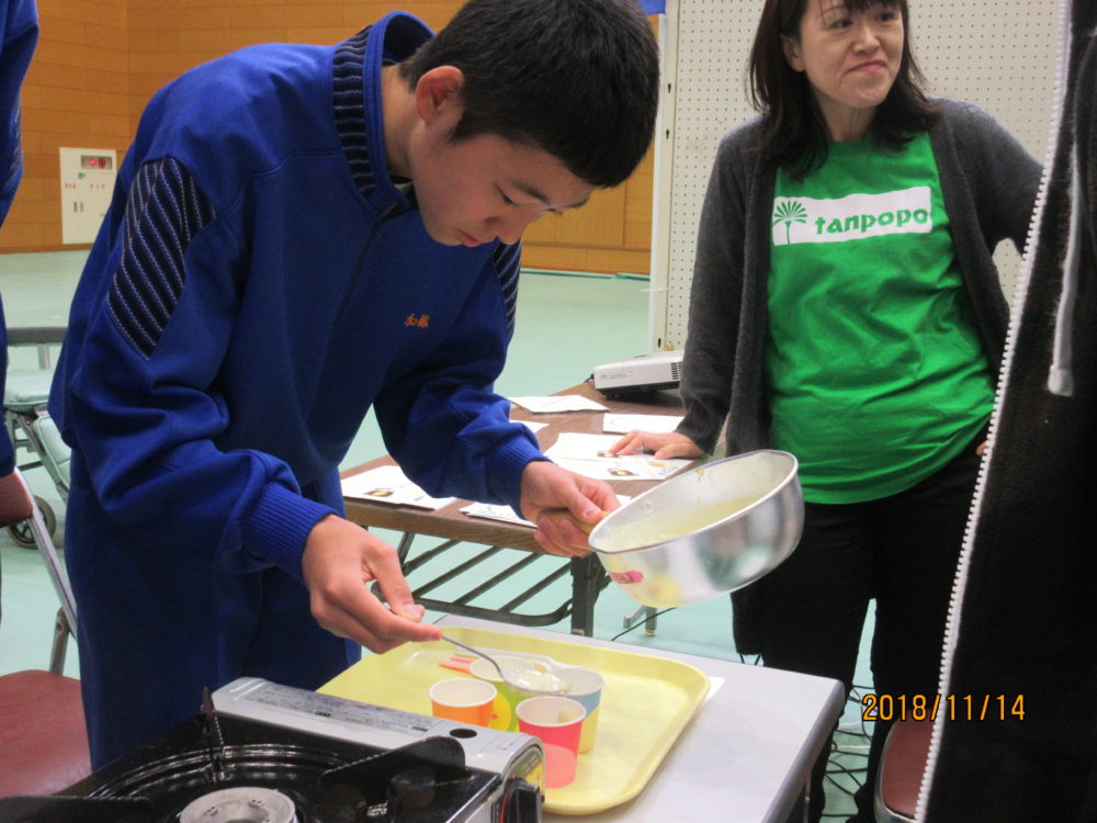 どちらかを選んで実際に調理してもらいました。どちらも、材料さえあれば3分ほどで作れます。狙いは、皆が普段食べている食材で簡単で美味しい介護食が作れると言う事を知ってもらう事でした。先生方にも興味をもっていただき試食も好評でした。