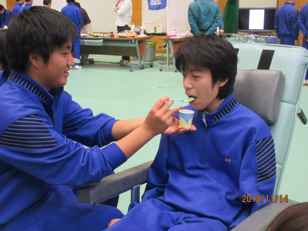 普段食事介助をする事がなく、まして相手がクラスメイトと言う事もあり照れてしまう生徒が多く、最初はなかなか介助が進みませんでした。 途中からコツをつかんだのか、声掛けもバッチリでぜひ介護職員にスカウトしようと職員同士密談してました(^^♪