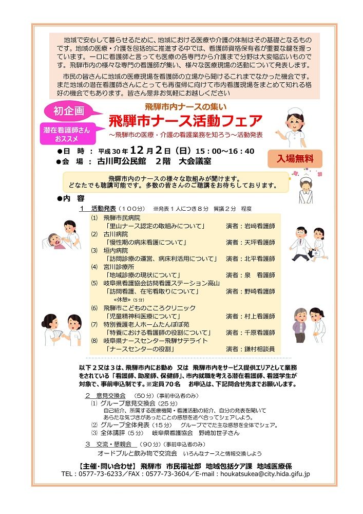 平成30年12月2日(日)古川町公民館において、飛騨市ナース活動フェアが開催されました。
