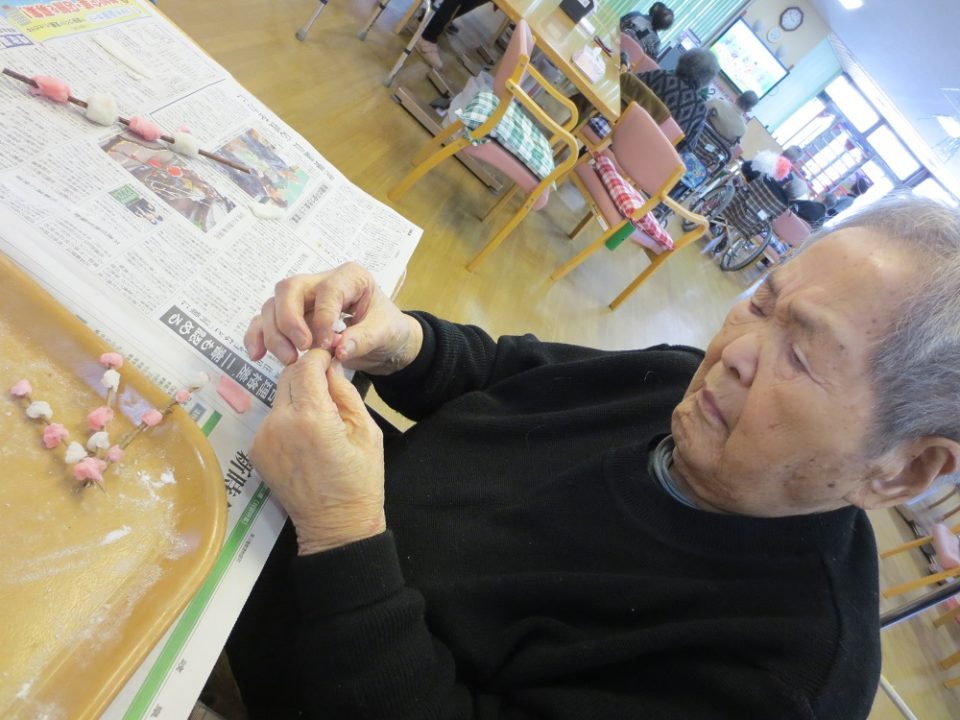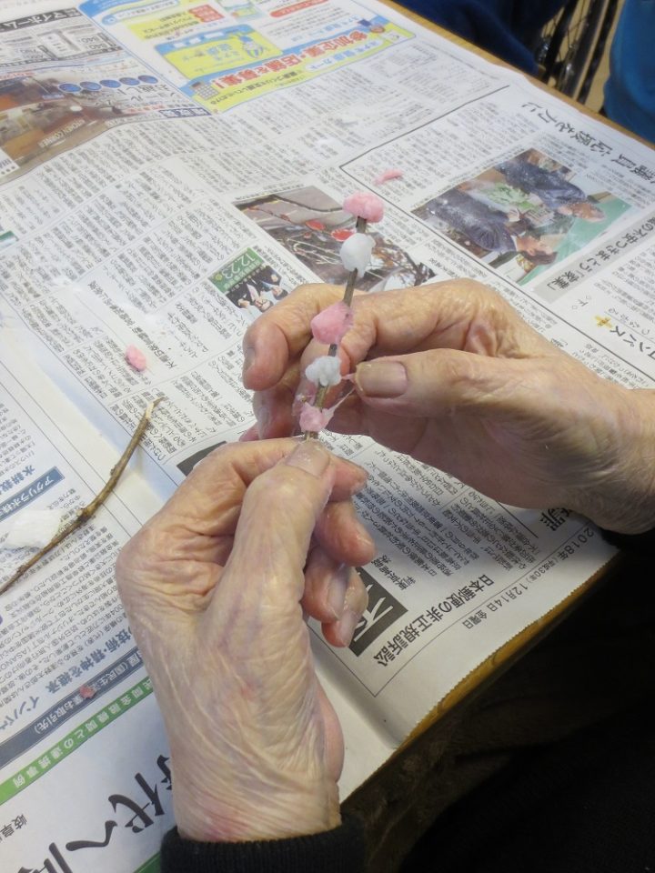 赤い餅を間隔を空けながら枝に巻き付け、次に白い餅をその間に巻き付けていきます。