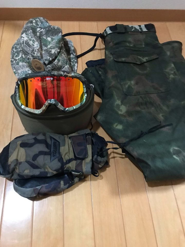 次に、「ビンディング、ズボン、手袋、ゴーグル、帽子」はなぜか迷彩で統一されている為「戦争でも行くのかい」って感じです。