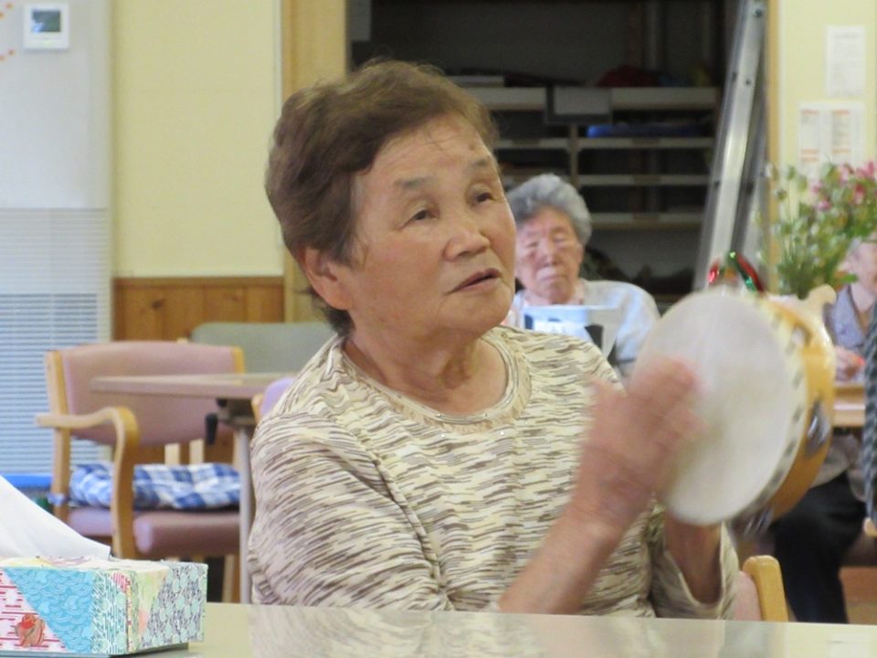 利用者の皆さんは楽器を持ち、音楽に合わせてリズムよく演奏してくださいました。