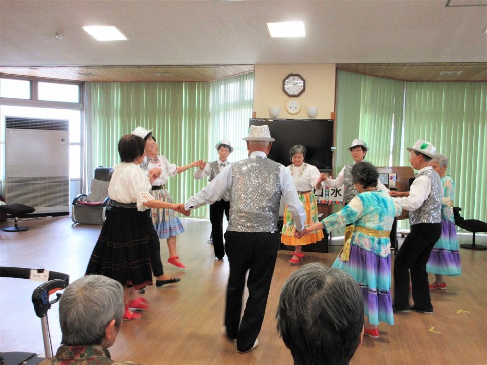 西川流花清様の「めでた」から始まり、フォークダンスサークル様の「マイムマイム」など馴染みの曲もあり、一緒に手を動かしながら踊られる利用者もみえました。
