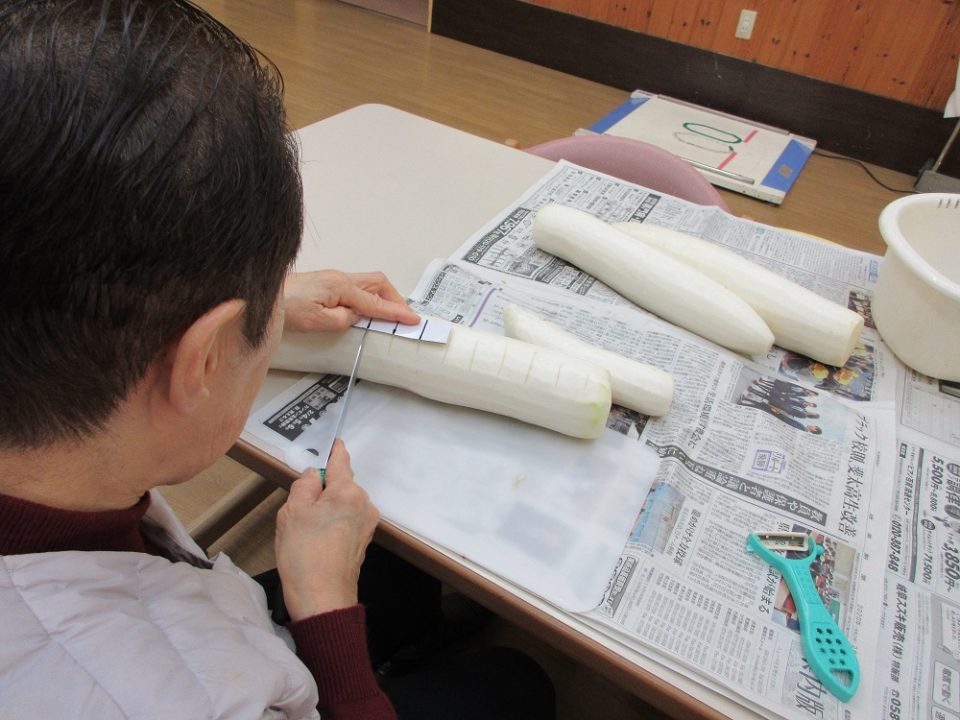 前回は大根の太さがまちまちだったので、今回はものさしを用意し、その太さに合わせて切っていただきました。