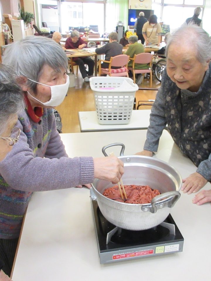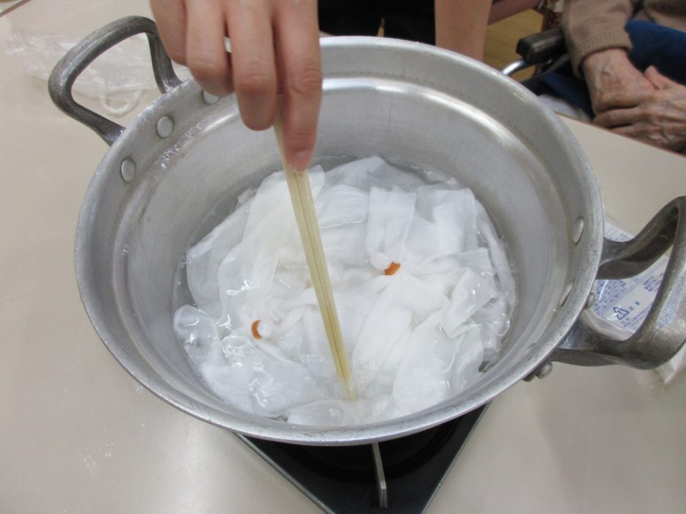 マスクが足りなくなる~という時には、デイにあったサラシや布でマスクを作ったり。
