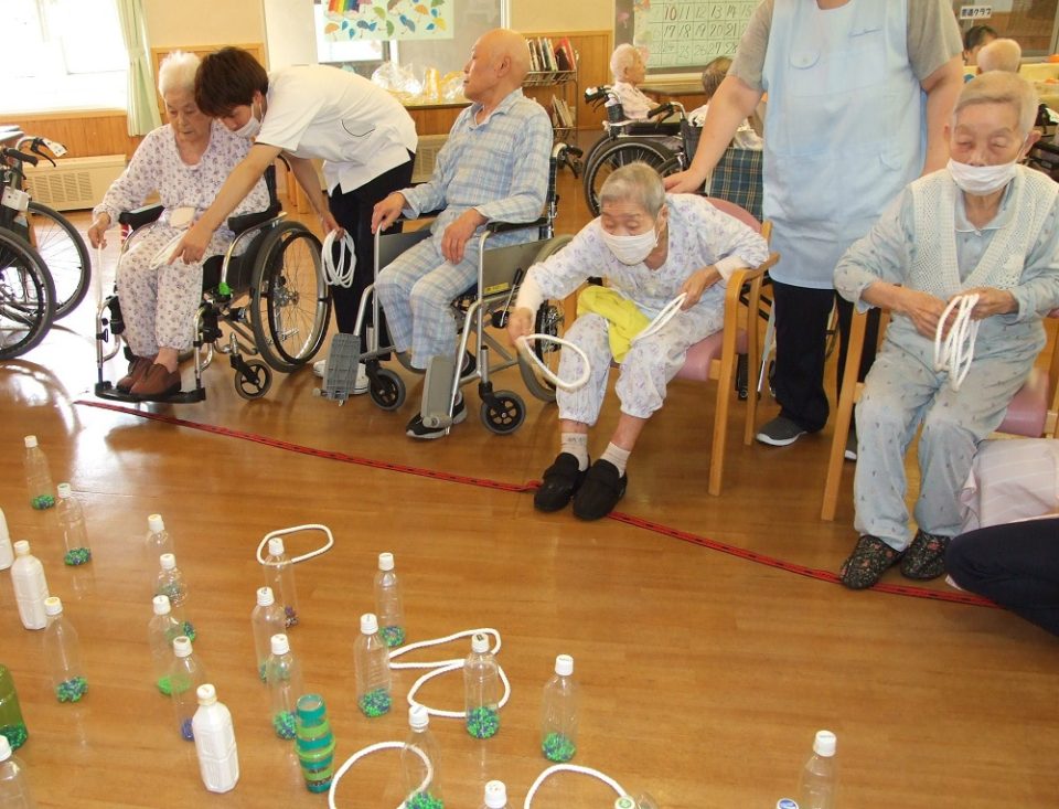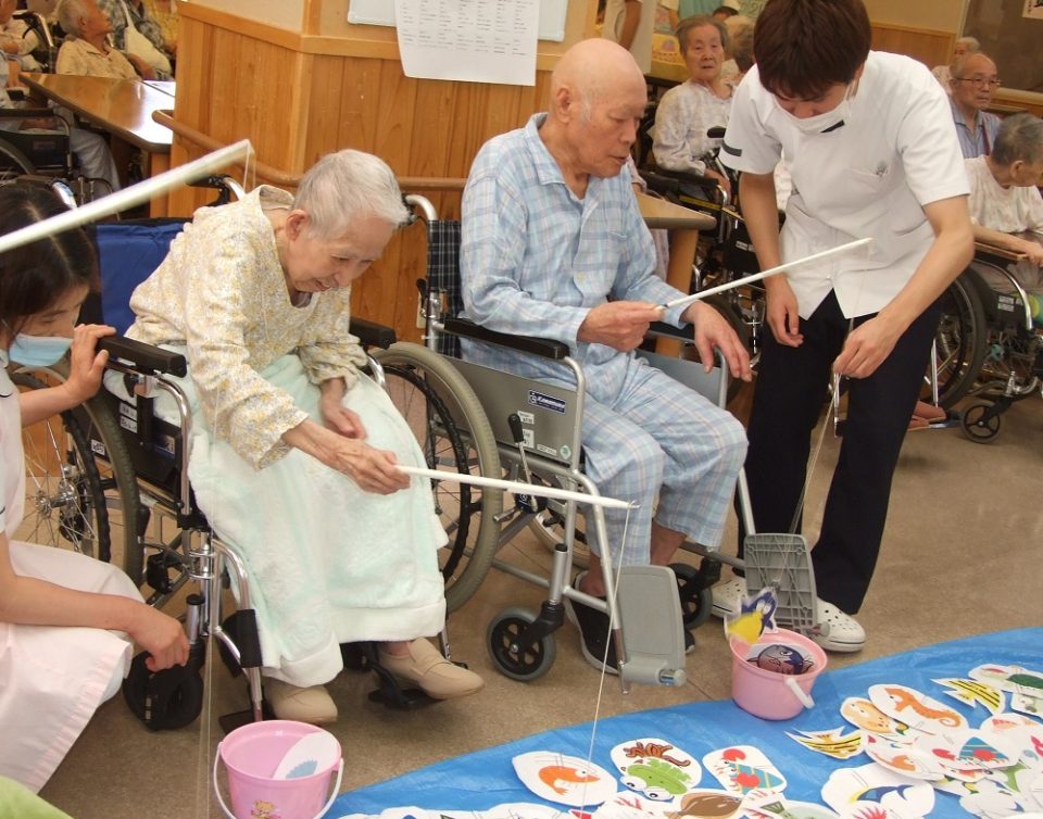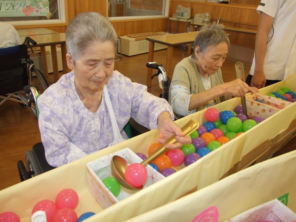 食堂に提灯などを飾り、会場はにぎやかに。自然と利用者様の笑顔も増え、レクレーションの魚釣りやボールすくい・輪投げは大盛り上がり♪ 職員もワイワイ♪