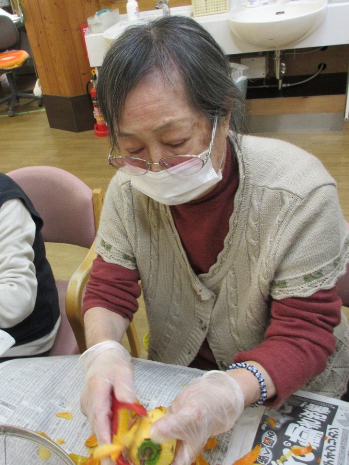 さっそく利用者に皮をむいてもらい、紐を付けました。
