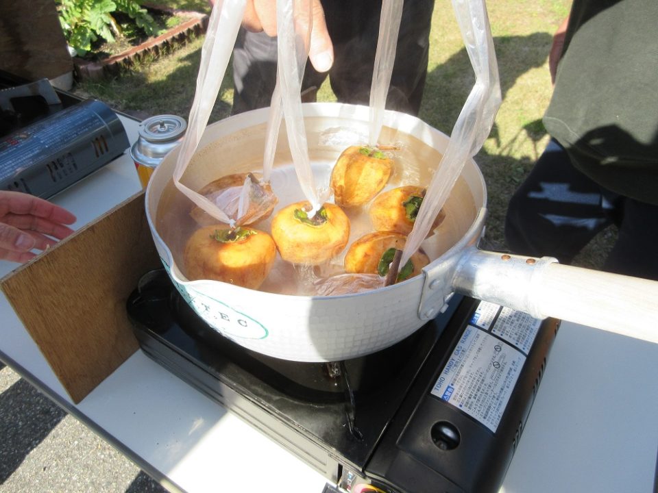 干し柿おじさん(=デイ管理者)が「熱湯にサッとくぐらせて、すぐ干す!絶対触ったらダメやで!触ったらダメやでね!!熱湯につけた意味なくなるで!」と、今年も念を押すだけ押して事務所へ戻ります。