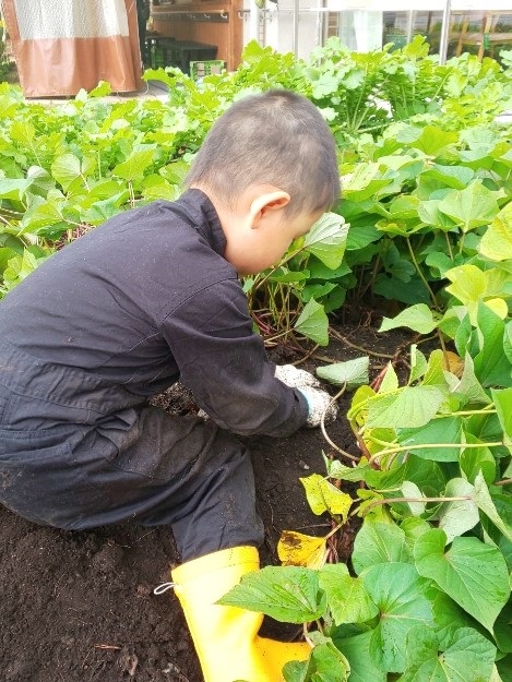 『天気の良い日に利用者に芋掘りしていただきましょう!』と計画しておりましたが、とても外で作業が出来る環境ではなかった為、園芸担当の職員とその子供ちゃんで芋掘りを行いました。