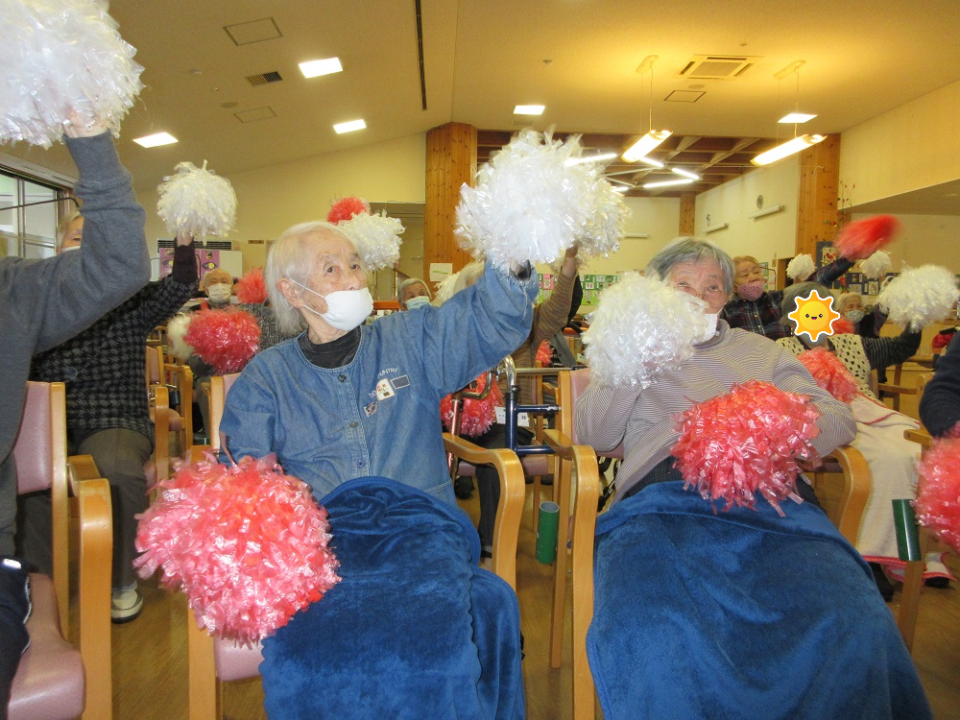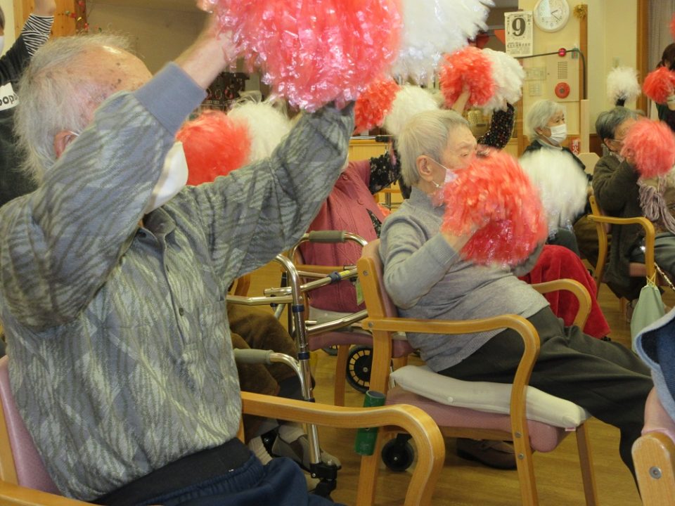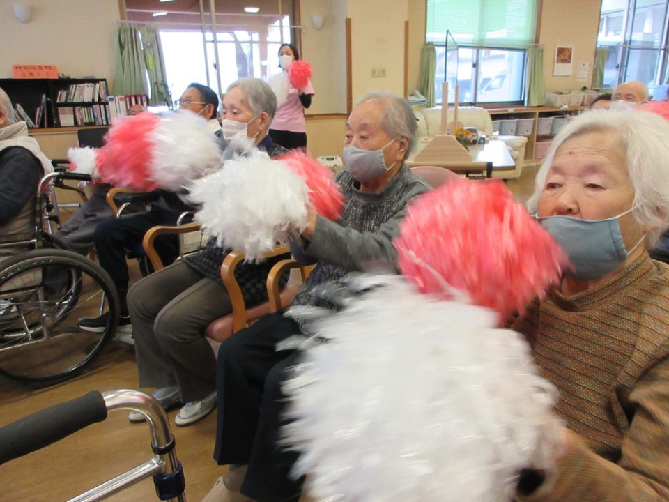 ゲームは皆さんもご存知「赤あげて♪白あげて♬」の旗あげを、旗でなくポンポンを使って行いました。