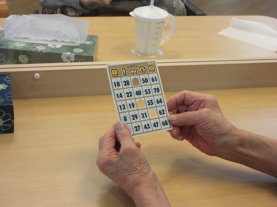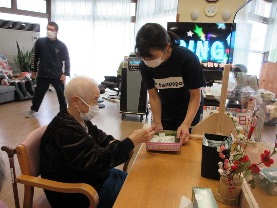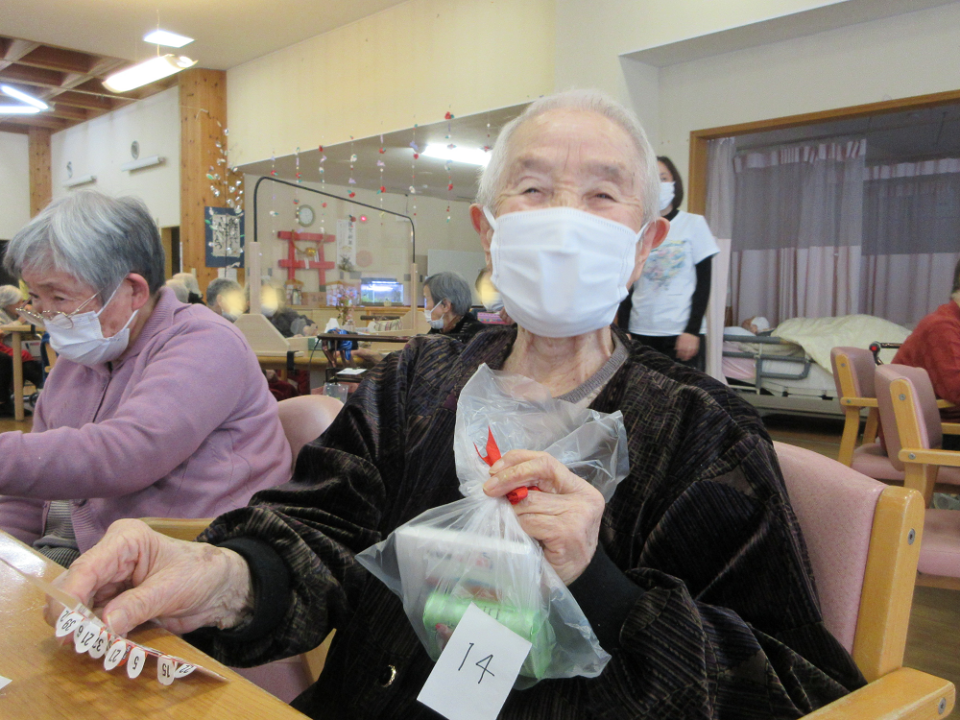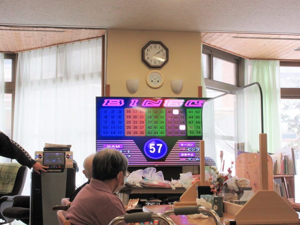 職員が確認すると…「あれ~!!揃っとるに~♫」『ビンゴーぅ!!!』と次々とビンゴとなる方が現れました!