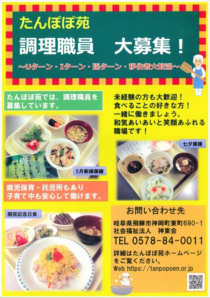 【求人情報】調理職員を募集しています。 投稿日: 2021/3/24 水曜日 カテゴリー: お知らせ 施設:特別養護老人ホームたんぽぽ苑 n.yonezawa たんぽぽ苑では、現在、調理職員を募集しています。 見学も受け付けています。 勤務時間や勤務日数についてはお気軽にご相談ください。