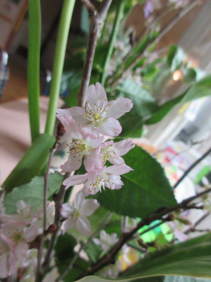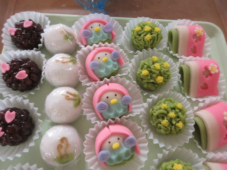 おやつには、春らしくおいしそうな和菓子が出されました。みんなで生けた花を見ながらおいしく食べました。