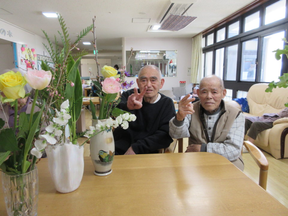 コロナ禍で先生の指導を受けての生け花ができないため、職員と入所者様で考えながら「こうのほうがいいんじゃない?」と言いながら楽しく生け花を行いました。きれいに生けられた花は入居者様の笑顔もありより一層きれいに見えます。