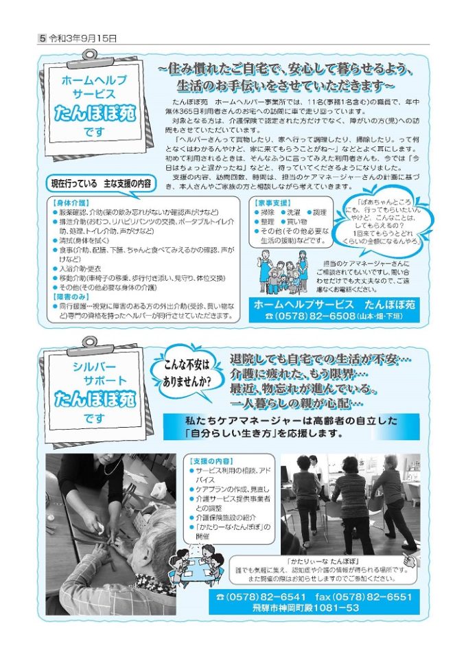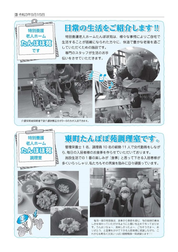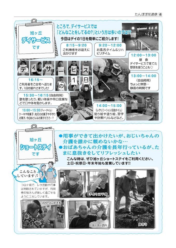 たんぽぽ苑通信第100号を発行しました! 投稿日: 2021/9/15 水曜日 カテゴリー: お知らせ、ご報告 y.kajino 季節は少しずつ秋らしくなり、涼しい風が吹くようになってきました。 体調にはみなさん気を付けてください。 この度、たんぽぽ苑通信は「第100号」を迎えることが出来ました!! 今回は、たんぽぽ苑の各サービスのご紹介を載せております。 みなさま、ぜひご覧ください。 今度ともよろしくお願い致します。 皆様のご感想やご意見をお待ちしております! ※今号を含め、これまでのたんぽぽ苑通信は、コチラにて読むことができます。