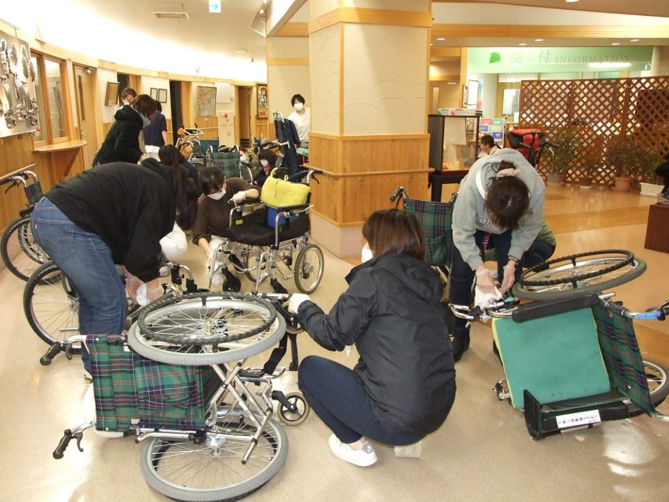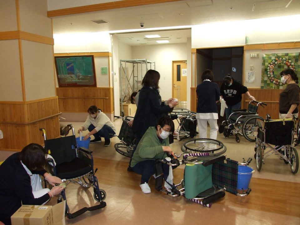 車椅子は毎日使用するため汚れやすく、それでいて使わない時間をみつけて清掃することが難しいため、ボランティアの皆さんには今回大変ご苦労をお掛けし、何台もの車椅子をピカピカにしていただきました。
