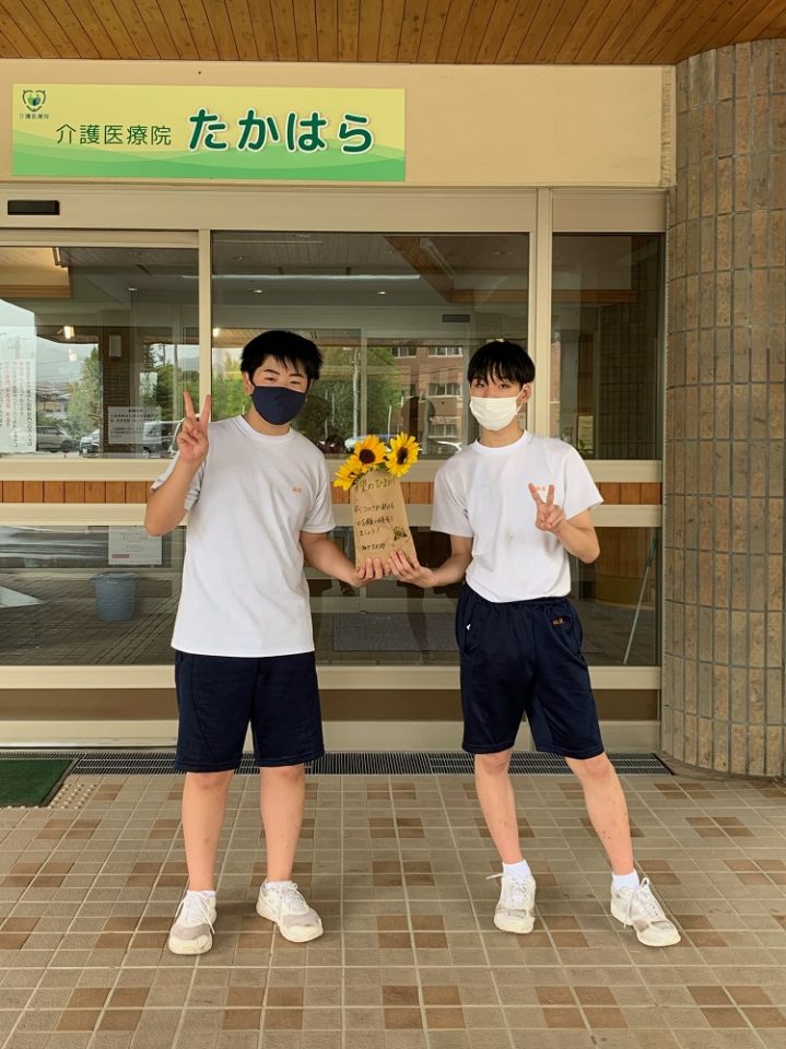 「早くコロナが終わるのを願い頑張りましょう!」というメッセージと共に、元気よく咲くヒマワリの花を届けてくださいました。とてもうれしいサプライズです!!