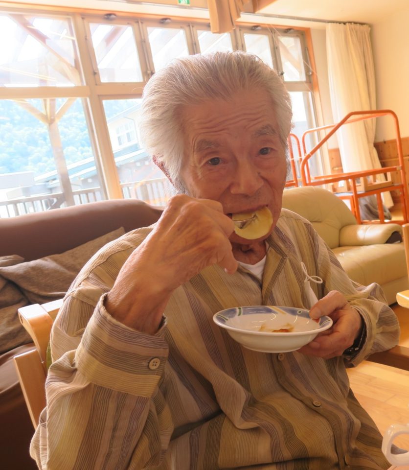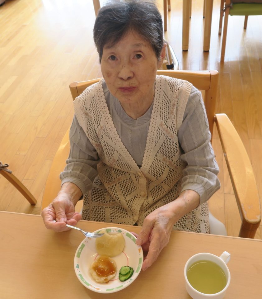 「餡が甘くておいしいよ」「ジャガイモでこんなのが作れるんやね」「豪華なおやつになったね」とみなさん、とても喜ばれ、「おいしかったー」と満面の笑みで食べてくださいました。