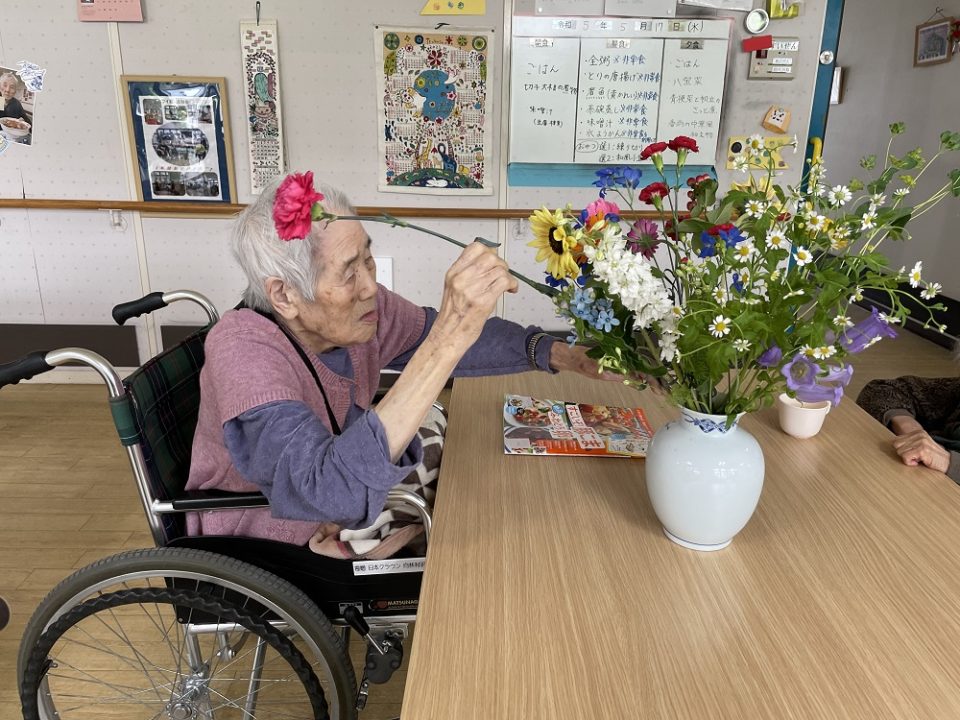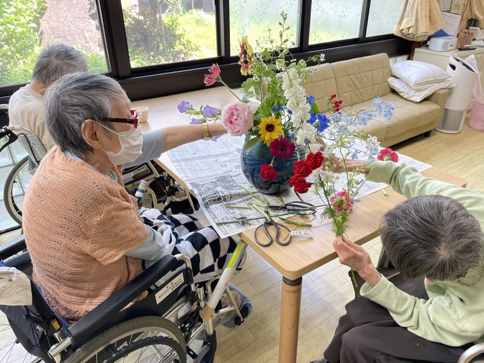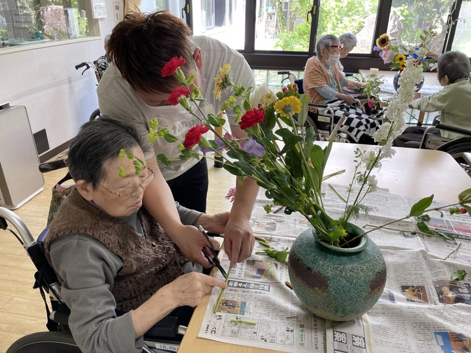 カーネーション・ガーベラ・シャクヤク等、季節のお花を用いた生け花を行いました。