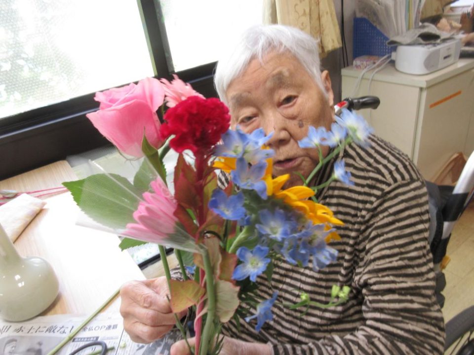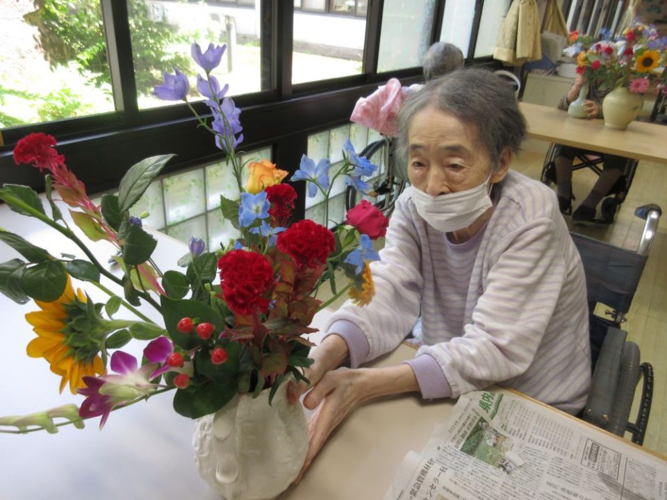 バラ、ひまわり、ガーベラなど色とりどりのお花の中から選び、バランスをみながら花瓶に生けられ,