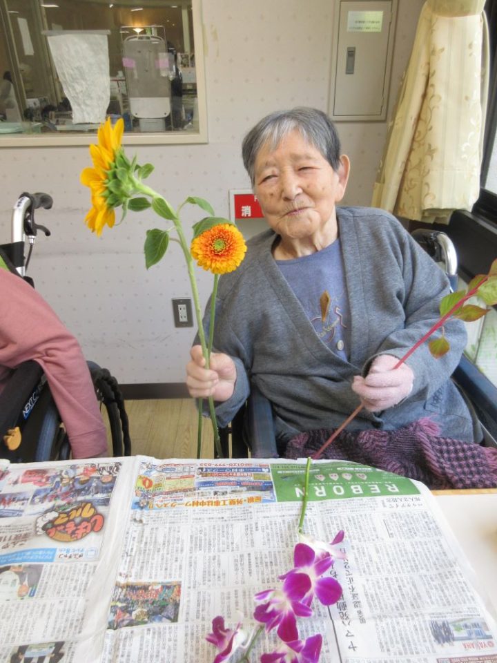 バラ、ひまわり、ガーベラなど色とりどりのお花の中から選び、バランスをみながら花瓶に生けられ,