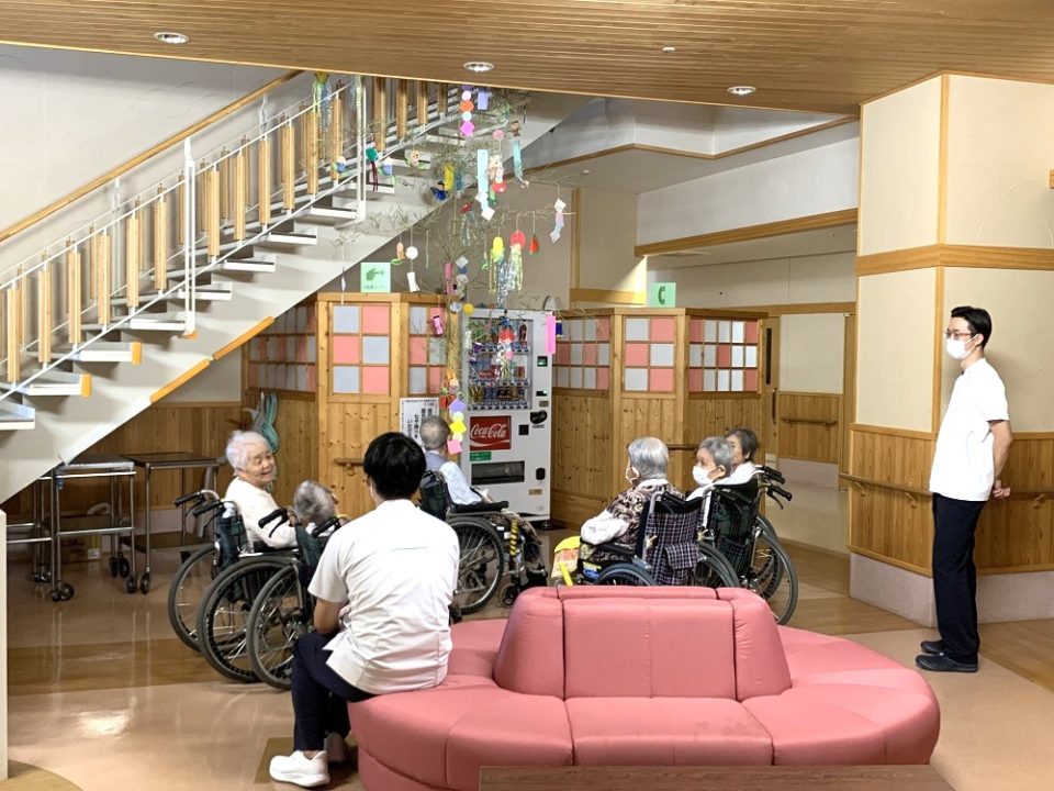 リハビリやグラブ活動で1階に下りてみえる入所者様が、笹飾りを眺めています。