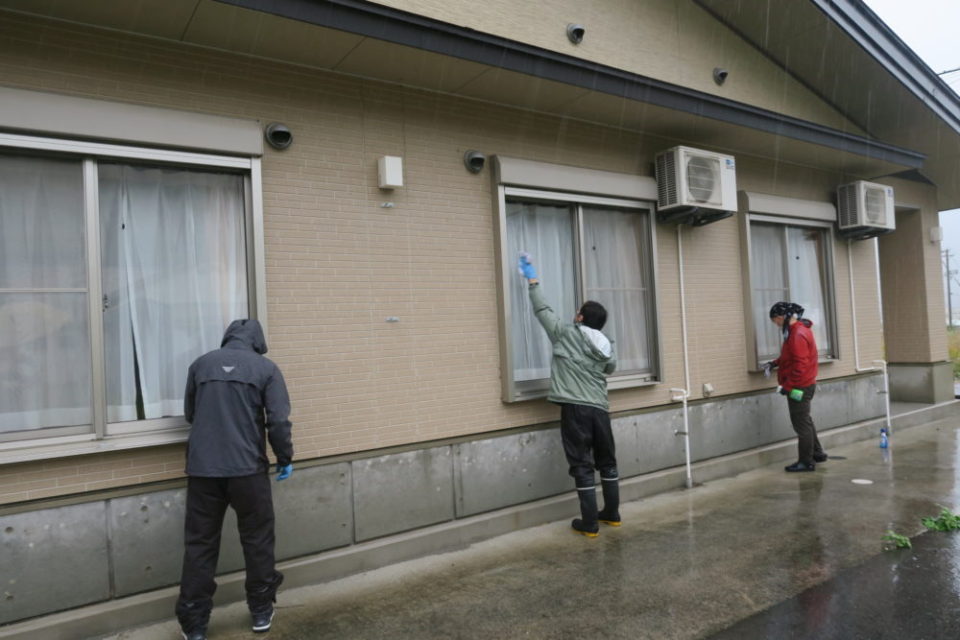 室内では車椅子やテーブルの清掃を念入りに、外では雨の降りしきる中、窓の清掃やガラス拭きなどを行っていただきました。