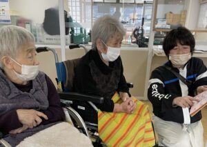 入居者の方々は、届けてくださった先生から贈り物一つずつの説明を受け、聞き入ってみえました。