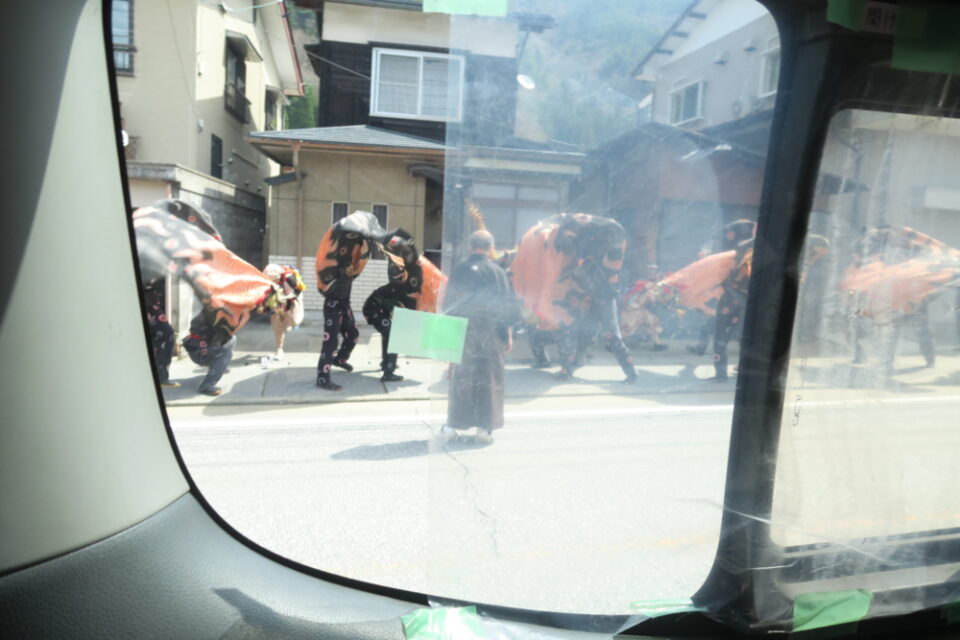 ちょうど、獅子舞社中のみなさんが、舞いを行っているところを車から見学させてもらいました。