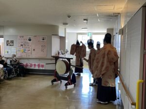 🌸春のお祭り🌸 投稿日: 2025/5/5 月曜日 カテゴリー: できごと 施設:特別養護老人ホームたんぽぽ苑 t.kobayashi 4月26日㈯ 東町の白山神社にて春の例祭が行われました。 今年も、神楽の方は苑内で雅な演奏を、また獅子組の方は正面玄関前で勇壮な獅子舞を披露して下さいました。 入居者のみなさまも大変喜ばれ、大きな拍手で応えていました。 獅子舞が終わった後、獅子組のみなさまから「一緒に写真を撮りましょう」と言って下さり、地域の皆様との交流を深めてもらえた事がとても印象的でした。 今年は近所の方々と、稚児や神輿が渡御に出る所まで見物する事ができ、入居者のみなさまは「来年も楽しみやなぁ」「若い子やらが頑張っとるで、私も頑張らんとな」と口を揃えて言ってみえました。 白山社中のみなさま、本当にありがとうございました。
