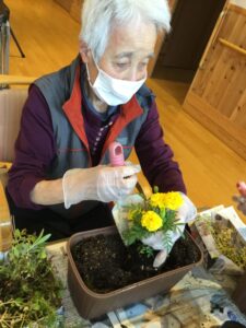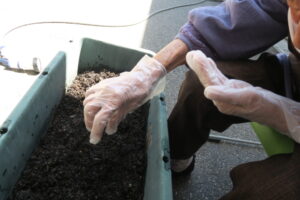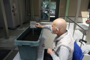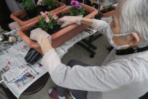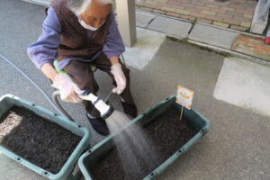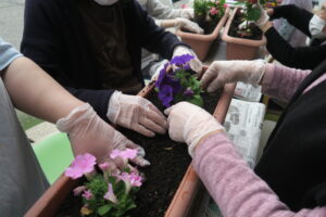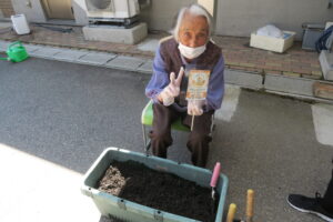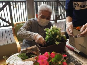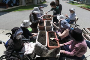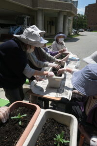 さすが家で畑仕事の経験者ばかりなので、手慣れた手つきで苗をプランターに植えてくれました。