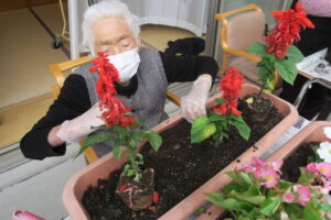 ベゴニアやマリーゴールドなどその他に職員が家で種から育てたジニアの苗も植えました。