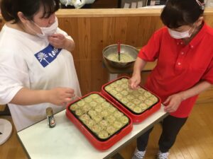 納涼祭の食べ物 いつもと違って3種類「そーめん」「たこ焼き」「ミニケーキ」をおいしくいただきました(ごちそう様)