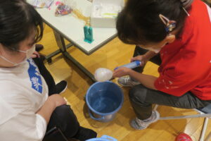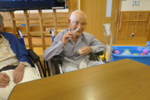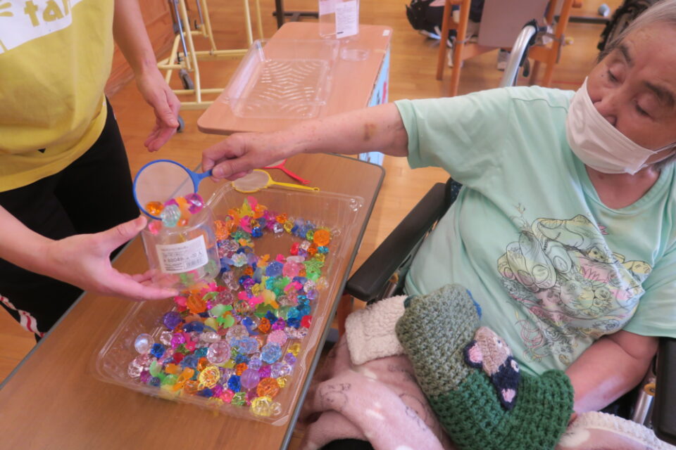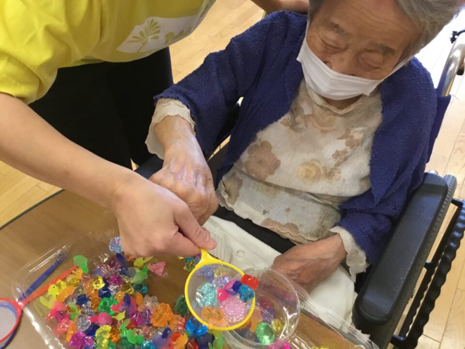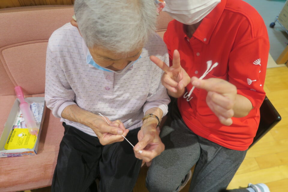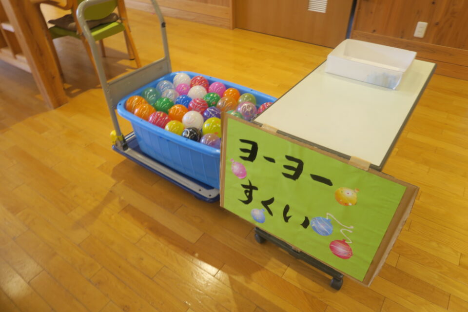 ヨーヨーを膨らませたり利用者さんに手伝っていただき、ヨーヨー釣りのこよりを作ってもらったりしました。