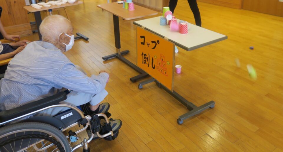 「コップ倒し」は、みんな真剣な表情で的を見ながら気合いっぱいです。