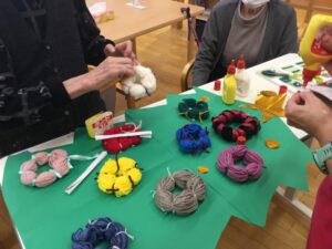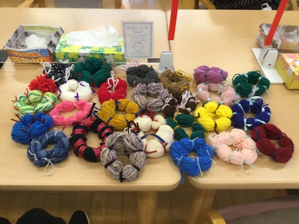 毛糸をグルグル巻きに束ねていろんな色のリースが完成!