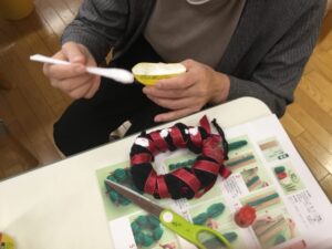 「みんなでもクリスマスらしい飾りを作ろう!」ということで、簡単な飾りでクリスマスツリーを作りました。