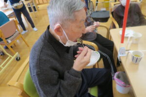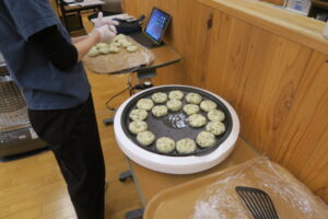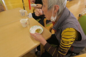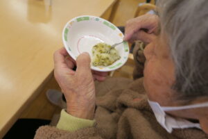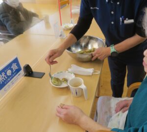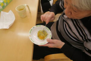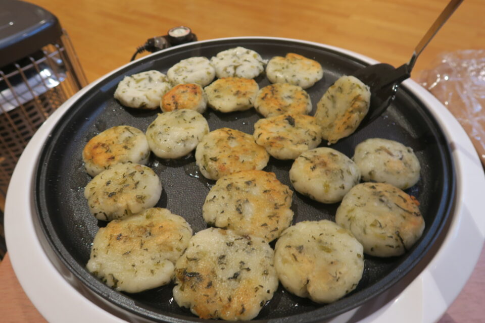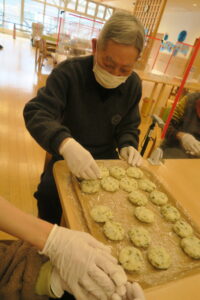 ひとつのテーブルに集まって、つぶしたじゃが芋を利用者さんが丁寧に丸めてこんがり焼いてできあがり!