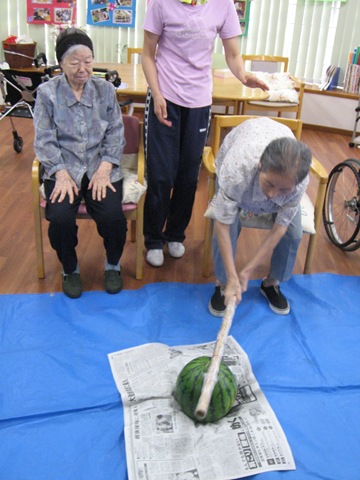 夏の終わりに。 投稿日: 2012/9/8 土曜日 カテゴリー: できごと y.araie 9月初旬 東デイでは、毎年恒例のスイカ割りを行いました。 小ぶりのスイカでしたが、とても良い音がしておいしそうです。 スイカを中央に置き、みなさんで順番にスイカを割って行きます。 割る棒が優しすぎて(!?)、スイカには当たりますが、なかなか割れません。 一人で3回ほどは割りましたが、とうとう最後まで割ることができず、スイカ割りは終了しました。 おやつの時間にみなさんでいただきましたが、とても甘くおいしいスイカで、つくづく夏の終わりを感じました。
